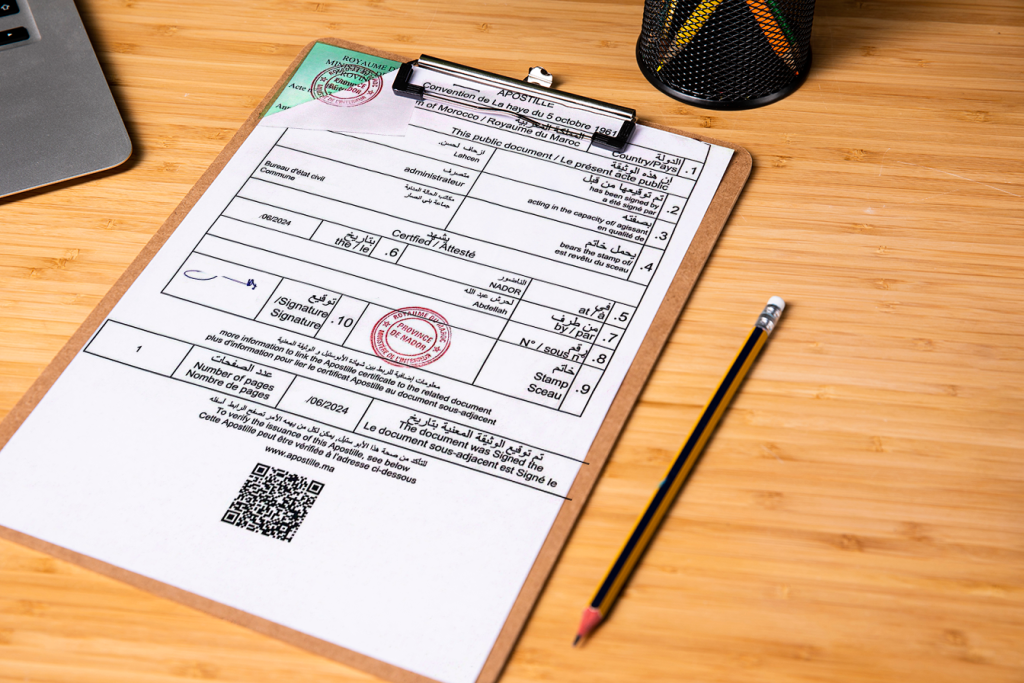 Para que el certificado de nacimiento de Marruecos tenga validez en España debe ir siempre acompañado de la Apostilla del Convenio de La Haya de 1961. La Apostilla o Apostille es una hoja adjunta al certificado de nacimiento en la que se certifica la firma del signatario del documento, en este caso, el acta de nacimiento.