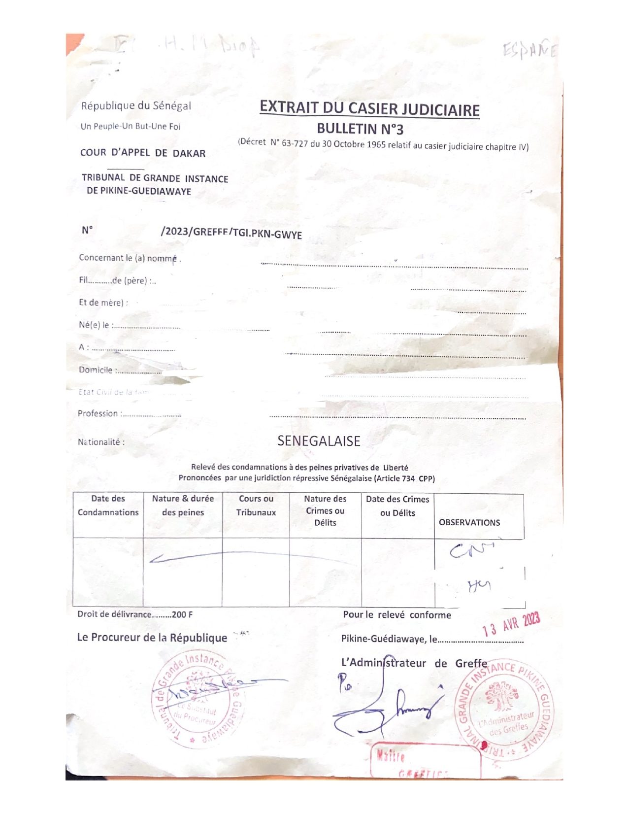 Como se aprecia en la imagen, el documento principal del certificado de antecedentes penales senegalés, lo conforma una página en la que se indica si el/la interesado/a tiene o carece de antecedentes penales, junto con sus datos y las personalidades que lo firman.