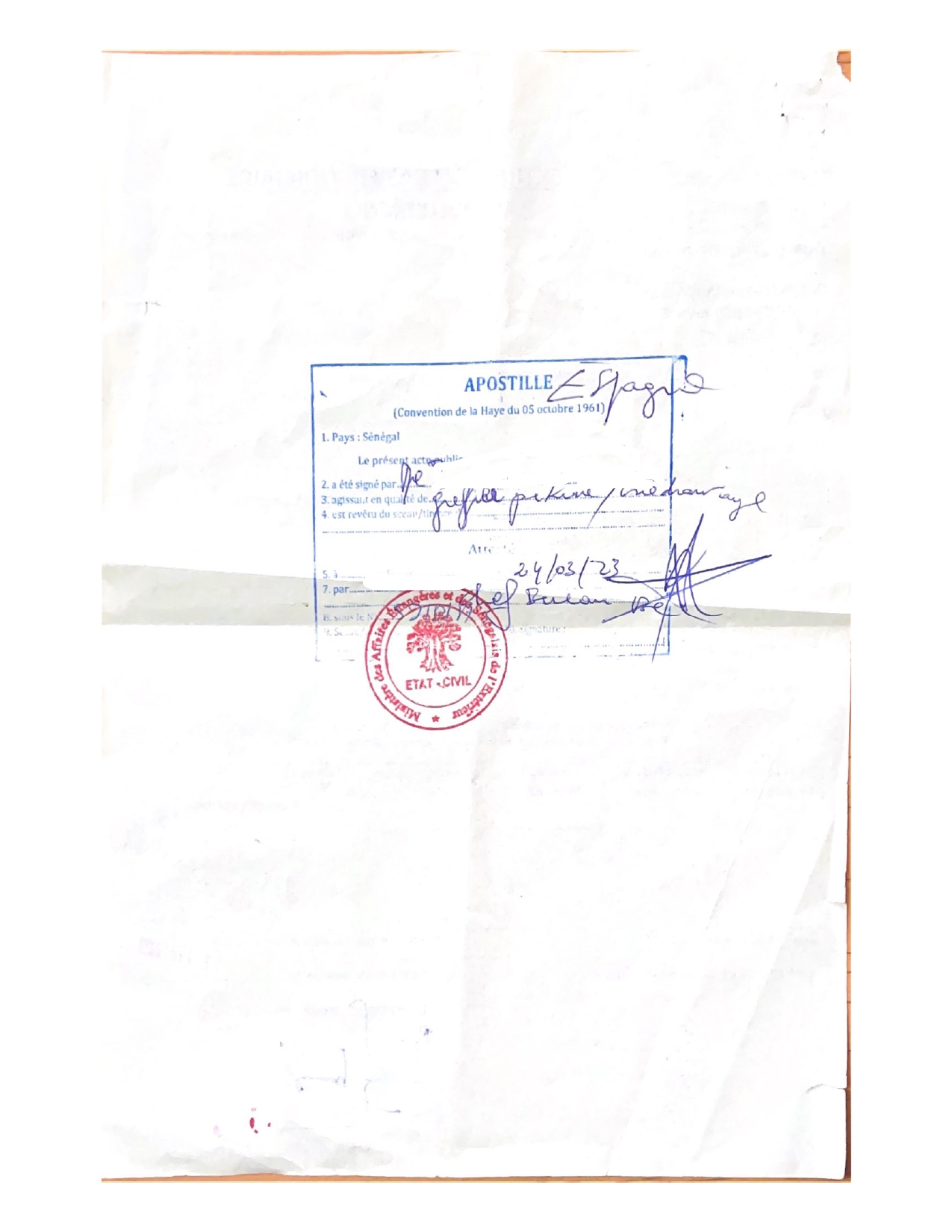 Con el fin de entender mejor este concepto de “Apostilla de La Haya”, tenemos a modo de ejemplo este certificado de antecedentes penales emitido por un tribunal senegalés.